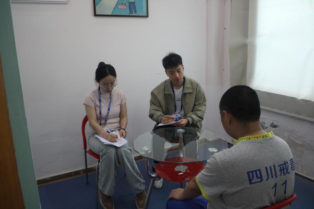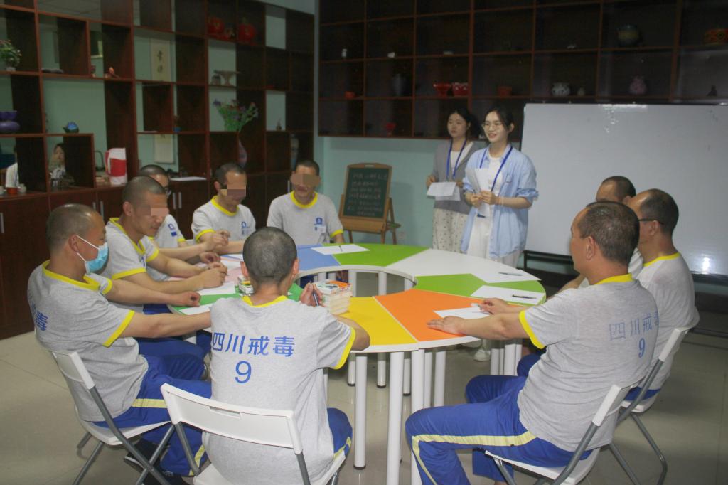 4月21日,团队11名心理学专业教师与研究生组成的三支小分队,在省资阳强戒所教育矫治科的统筹安排下展开工作。第一组针对前期心理测评中筛选出的12 名高压力值戒毒人员,精心设计“幸福清单”“幻想礼物”等团体辅导项目。活动现场,戒毒人员在主持人侯思敏的引导下通过身体放松训练、正念呼吸练习和小组分享,逐步卸下心理防备,一位参与者坦言:"很久没有这样畅快地说出心里话,原来有人真的在认真听我们的痛苦。"