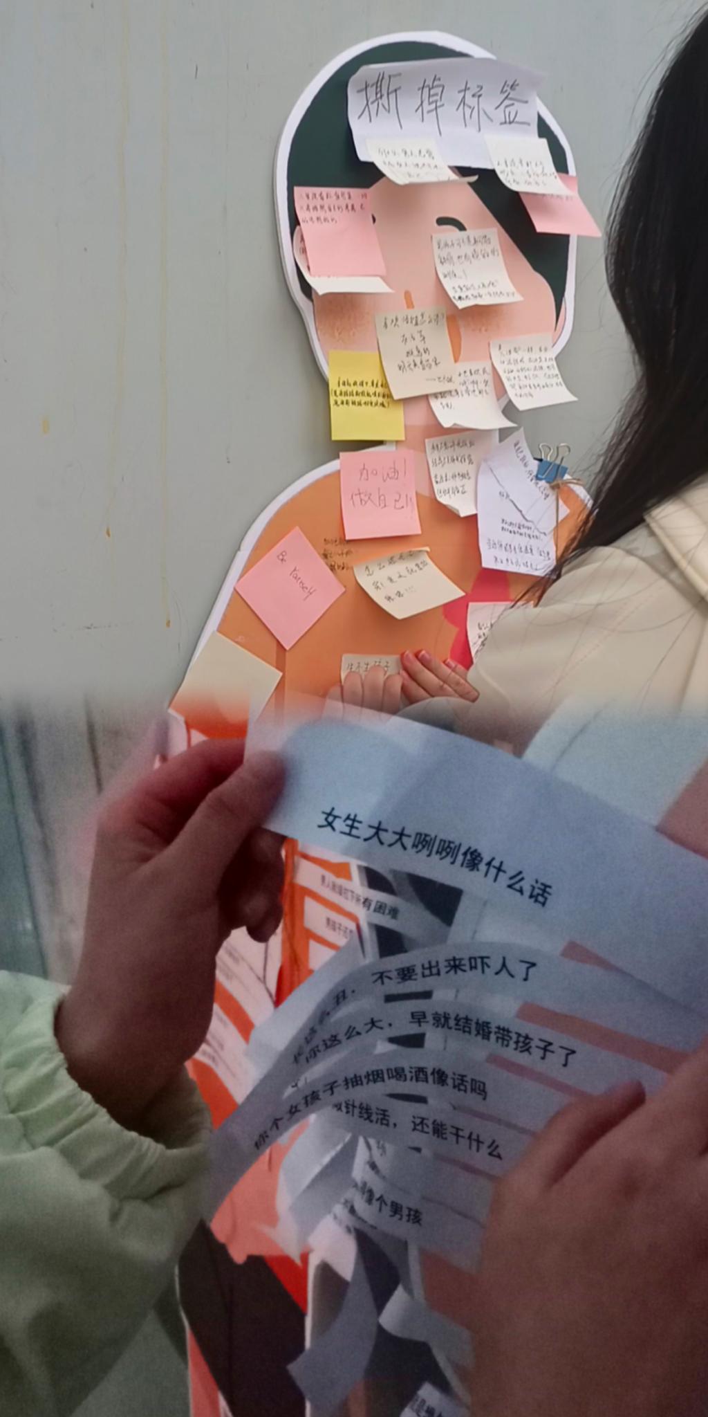 活动伊始,在摆放立牌的食堂门口,参与活动的同学们纷纷摘下立牌上“带有刻板印象的歧视性”标签,贴上自己对于各种偏见的看法:“拒绝内耗”“每个人都有做自己的权利”“人生没有标准答案”等,青年的意见犹如一条清流穿行在世俗的言论当中,这些别具一格的语言无不彰显出青年们独特的个性和积极的态度,也和本次“撕掉标签,不被定义”的活动主题相得益彰。