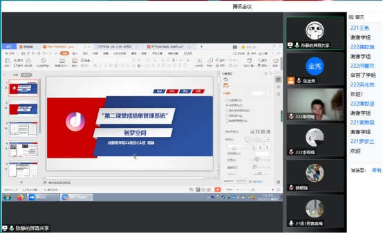2021级1班班长陈静给大家讲解了第二课堂成绩单的要求与注意事项,其中重点讲解了到梦空间的使用方法,建议学弟学妹多参加活动,不断丰富课余生活。