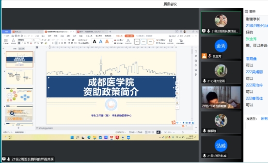学生资助管理中心程兰老师给同学们介绍了我校实施的大学生资助政策,其中重点介绍了国家资助、学校资助和社会资助的种类以及申请方式。2021级2班班长魏琼则在此基础上给同学们分享了具体的申请步骤、操作方法和需要准备的材料。