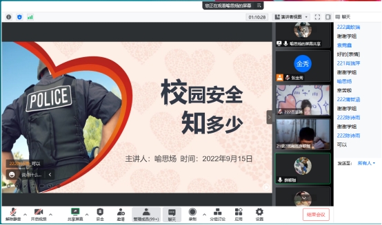 2021级1班体育安全委员喻思炀则从防盗、防骗、校园贷和交通安全等方面给大家介绍了校园安全,以此提醒同学们提高安全意识。