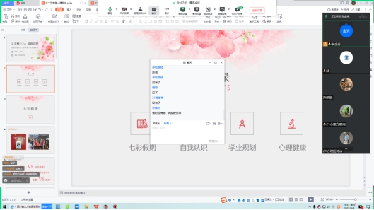 会上,辅导员带领同学们了解了省、市、学校的最新防“疫”动态,提醒同学们在做好疫情防控的基础上学好网课。接着,辅导员就班级近期事项进行了安排,提醒同学们加强时间管理,不断提升自身技能,同时督促各位骨干各司其职,坚持从不同层面服务同学,真正关心帮助网课学习困难同学。此外,辅导员还进一步督促了七彩假期“优秀实践个人”和防疫“最美志愿者”评选活动的开展。最后,辅导员就各班同学关心的问题进行了答疑。