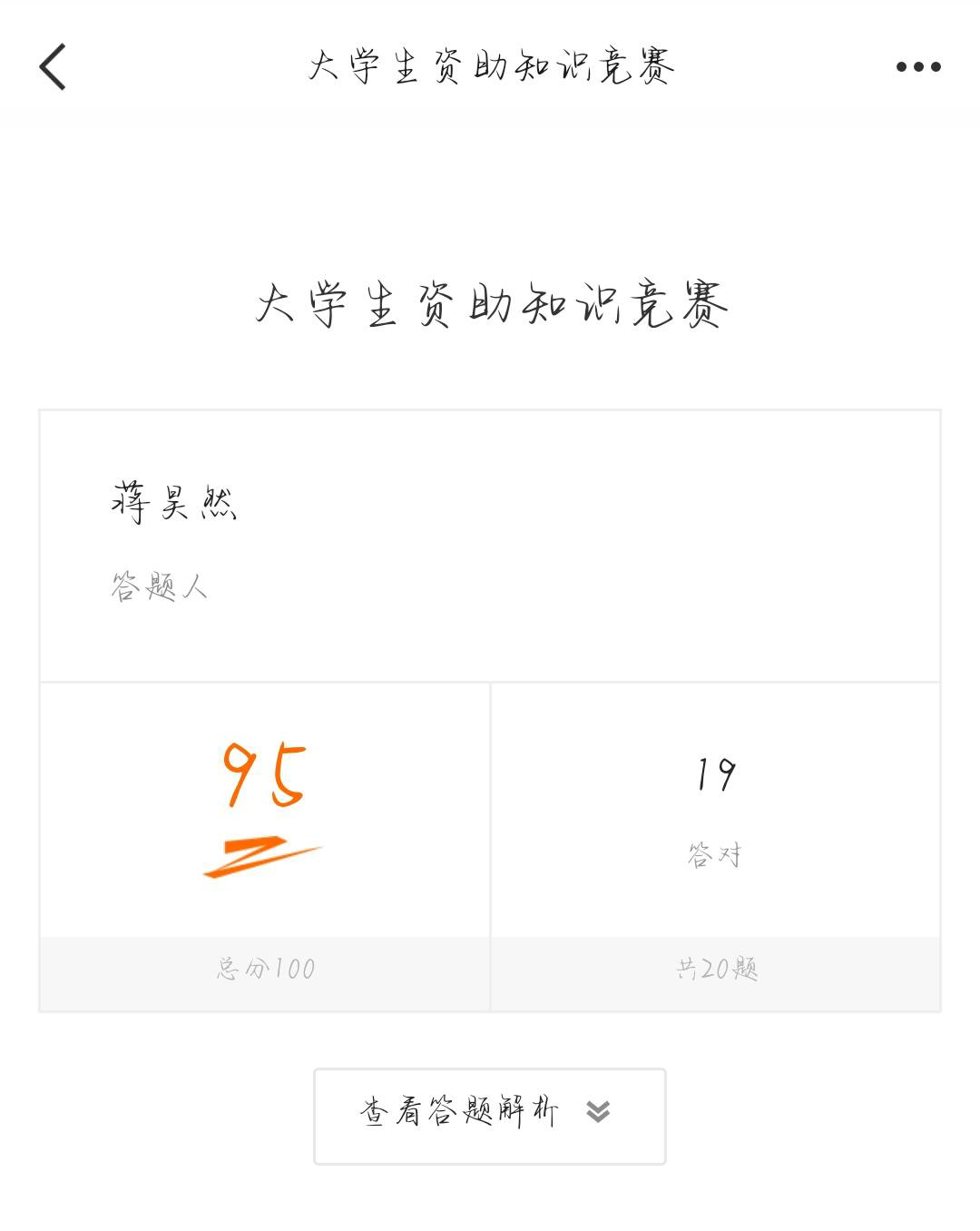 此次知识竞赛依托问卷星,以线上答题的方式开展。内容涉及国家奖助学金、校内奖助学金、勤工助学、特殊困难补助、助学贷款、学费减免等方面知识。同学们踊跃答题,积极参与。最后,石楚清同学以答题速度快和正确率高获得了一等奖。