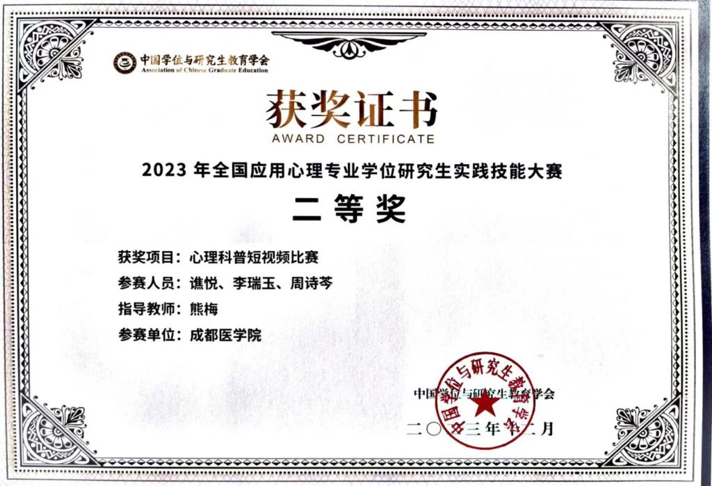近日,在2023年全国应用心理专业学位研究生实践技能大赛中,ok138cn太阳集团师生荣获佳绩:谯悦、李瑞玉、周诗芩团队(指导教师:熊梅),荣获心理科普短视频比赛全国二等奖;张莫婷、陈鹏团队(指导教师:唐平),荣获应用心理教学案例开发比赛全国三等奖。