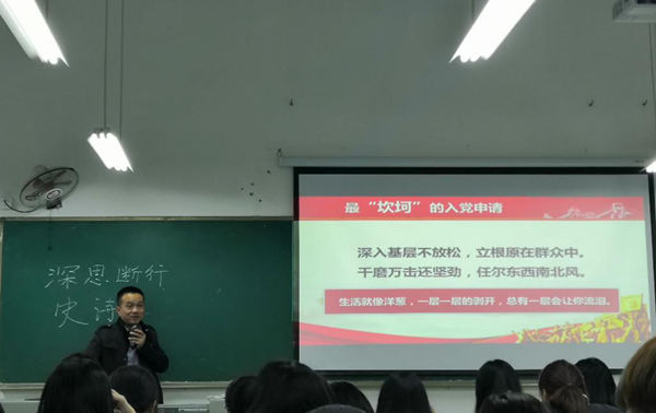 郑崛村书记以历史上五种特别的入党申请为例,用生动的语言带领大家回顾了老一辈党员的初心和使命。在讲到刘伯承最“牛气”的入党申请时,他强调:“同学们一定要学会深思断行。”他用最“坎坷”的入党申请——习近平总书记曾十次入党被拒的例子,鼓励同学们不放弃、不气馁,努力变得优秀,积极向党组织靠拢。他用最特殊的入党申请-1948年攻打济南城前一名叫做滕元兴的新兵刚放下写申请的笔、又拿起枪,冲在了攻城的最前沿的例子,讲述共产党人为人民利益牺牲一切的决心;用最“朴实”的入党申请--一名基层医务人员默默奉献的例子,诠释党员全心全意为人民服务的真谛;用最“霸气”的入党申请-一名军队护士要磨砺一把锐利的尖刀,永争第一的例子,鼓励同学们勇攀医学高峰。